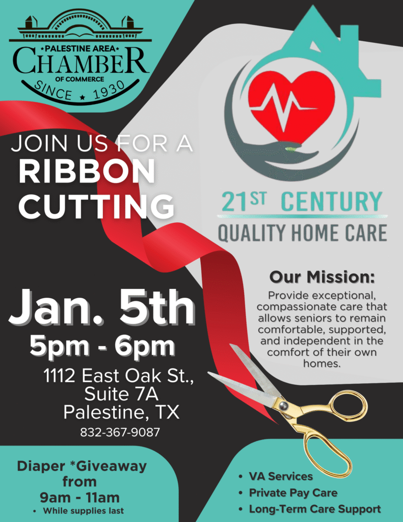 Weβre excited to invite our community to the Ribbon Cutting Ceremony of 21st Century Quality Home Care, proudly in partnership with the Palestine Area Chamber of Commerce.